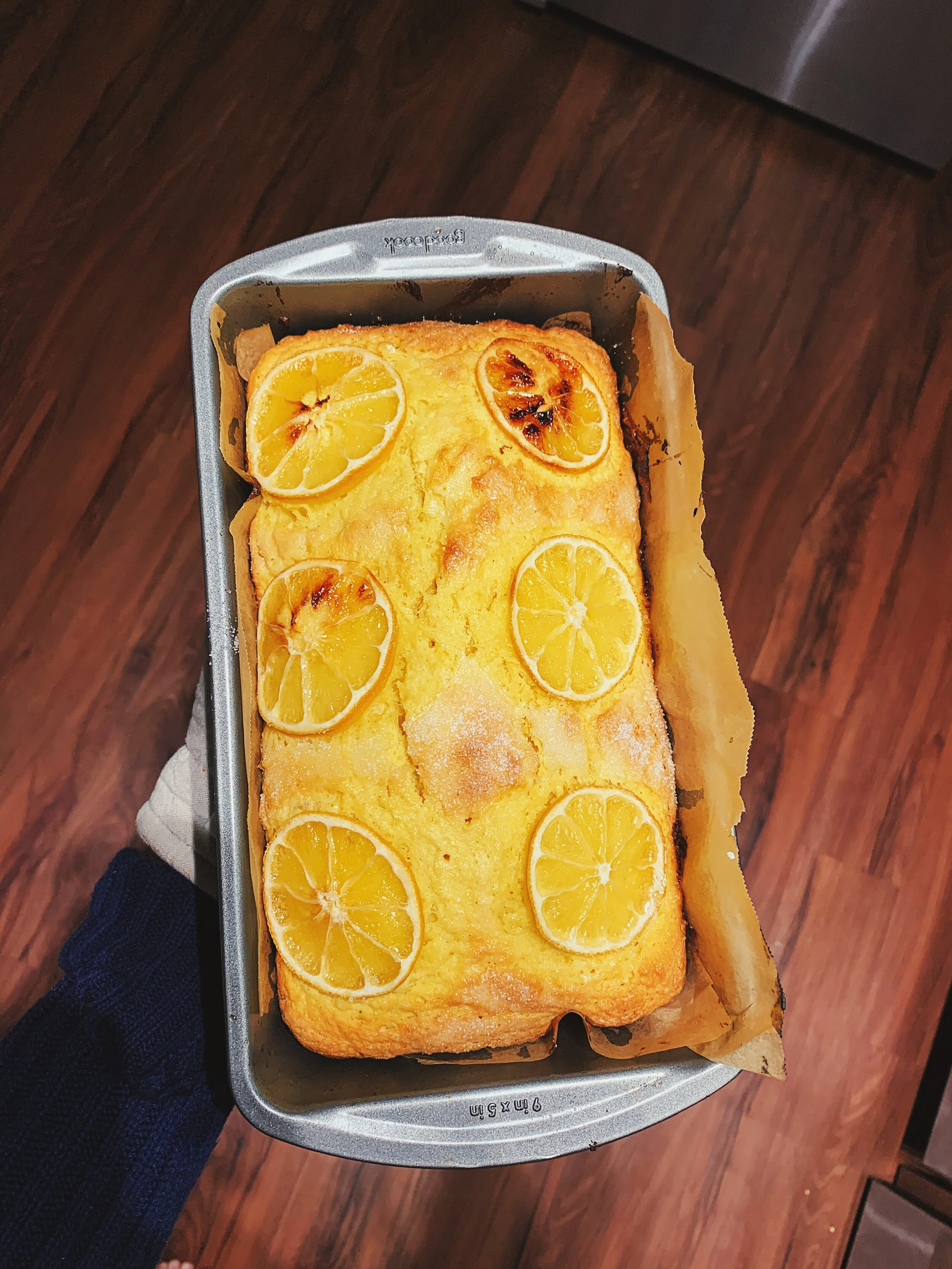 Beyond flour, sugar, turmeric, and the typical baking dried ingredients, this recipe utilizes 2 tablespoons of lemon juice and 2 tablespoons of zest. The first step is incorporating the sugar and the zest by rubbing it together with your fingers, thereby turning the sugar a light yellow and releasing the lemony aroma. The sugar is then whisked into the eggs, lemon juice and greek yogurt/sour cream. A stick of melted butter and other dry ingredients get folded into the batter just before pouring it into the cake pan. Thinly sliced lemons and sugar top the cake. The lemons looked really nice, but I had to be careful not to let them burn.